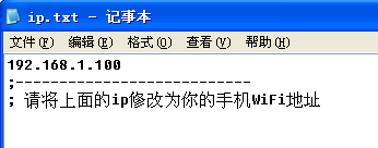 2、将压缩包全部解压,编辑“ip.txt”文本文件,将里面的ip地址修改为你的手机WiFi地址;