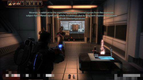 杀完后照例搜刮一下。回头去接下来的电脑室,这里有台电脑可以得到点神秘美妞Miranda的资料,她是Shepard重生计划的主要科学家成员之一。*这里提一下,我觉得ME2里面对话选项的多少是根据Shepard本身获得资讯的多少决定的,所以不闲麻烦的应该多对话和收集信息。*此处房间地上有个datapad,hack后可以搞点钱。搜刮完后去甲板区域的另一端。