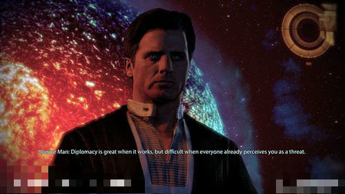 直到你面见I-Man,Shepard才发现这个神秘人并不在船上,他通过全息投影,在某个不知名的地方和你对话。对话的选项挺多,照旧挖掘点内容。记得善恶的选项影响,以后不多作提示了。I-Man很开门见山的表明自己的立场,确保人类的生存是他的终极目标,但这个目标正被某种势力威胁着。他坚信Shepard是唯一能抵抗这股神秘势力的人物,所以才不惜一切复活你。行动的第一站是星盟的总部Freedom's Progress,哪里正被敌人包围着。自此质量效应的世界正式开启。