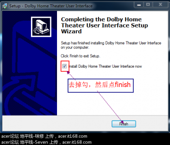 2.下载杜比驱动完整版。因为里面有32位和64位两种版本,所以有257M之大.运行后会解压到C:\DRIVERS\WIN\DOLBY,但先不要让它开始安装,出现以下界面时去掉勾,然后点finish