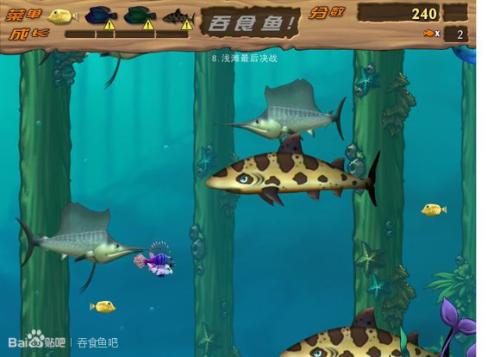 创 意: 游戏已经是很有创意的了,说的通俗一点就是大鱼吃小鱼。之前对你紧追不放的大鱼,不久之后就成了你的美餐了~~~(在吞食鱼2中又加入了水上面的游戏场景,你的小鱼可以跳出水面吃小飞虫,传说中的“飞鱼”来了!)