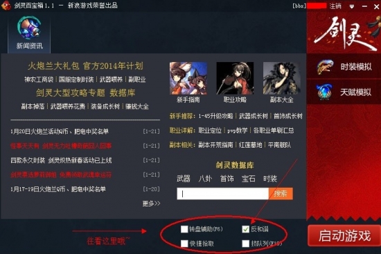 答:打开剑灵百宝箱,在底部可以看到4个功能,在需要使用的功能前方框位置打上勾,然后点击右下角的 “启动游戏” 即可正常使用.