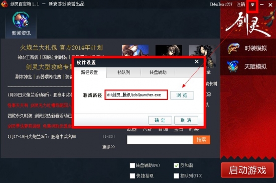 答:剑灵百宝箱默认的游戏读取路径是在【d:\剑灵_腾讯】这个目录,如游戏路径有更改,请点击软件右上方倒三角按钮,点击“设置”游戏路径