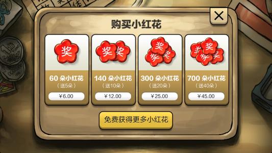游戏提供道具“小红花”辅助过关,“小红花”道具通过支付宝购买,分别包括: