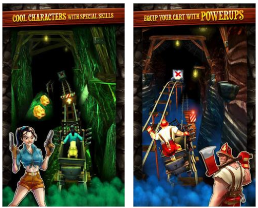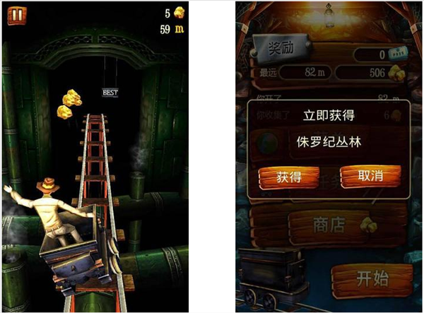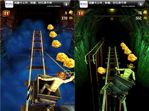 矿车大逃亡相对于逃离神庙可玩性更高,玩家需要面对的障碍越来越多,节奏感也非常不错,有些地方的关卡略有难度。玩家在玩矿车大冒险的时候可能会不自觉的全身跟着动起来,这就是它的魅力所在。
