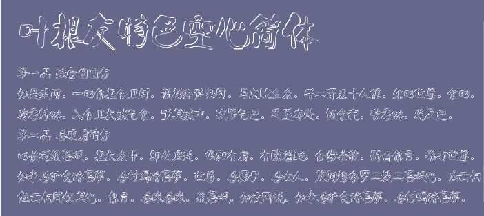 叶根友空心简体是由叶根友先生创作的一款最新字体,艺术效果欣赏性实用相结合.是设计师们的首选