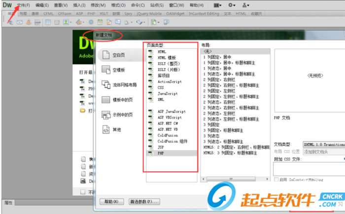 1、在网页三剑客正式版点击菜单栏目的文件---选择新建---会弹出新建文档,里面有很多的页面类型,可以选择需要的,然后点击--建立即可。