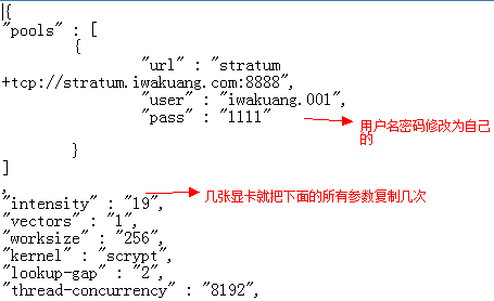 解压刚下载的CGMiner挖矿软件,下载完成后复制到解压后的文件夹,此时,目前配置文件都是针对单显卡的,如果你带6个显卡,则把各参数都设为6个即可。另外,记得修改用户名密码噢。