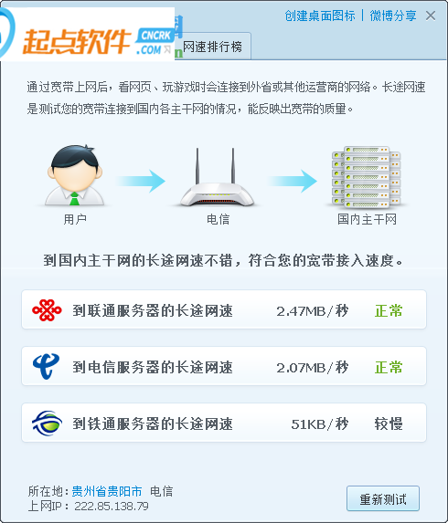 3、长途宽带速度,测试您的宽带连接到国内各主干网的情况、能够反映宽带的质量