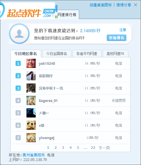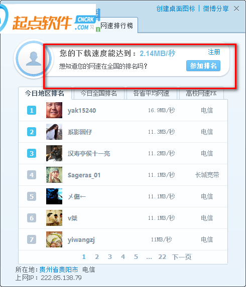 4、网速排行榜,在这里可以查看他人的网速情况,可以进行PK,支持地区排名、全国排名、各省排名、高校网速PK