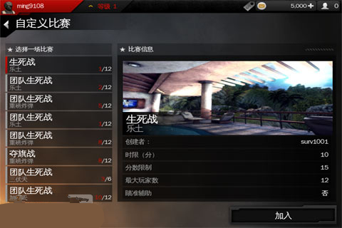搜索自定义比赛同样非常容易,点击之后会列出一系列的自定义比赛。你可以选择一场比赛进入,人数足够后就可以对战了。