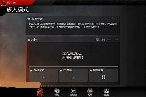 《现代战争4 决战时刻》是Gameloft的最新FPS作品,这款游戏成功地延续了系列作品的优点,既有紧张刺激的单人战役也有一系列对战模式。从某一方面来说,这款游戏可以称作手机或者ipad上的CS。你既可以和朋友在本地建立一个地图互相对战,也可以通过GL live账号与世界各地的《现代战争4》的玩家对战。在游戏首页面点击多人模式,就可以进入联机对战。