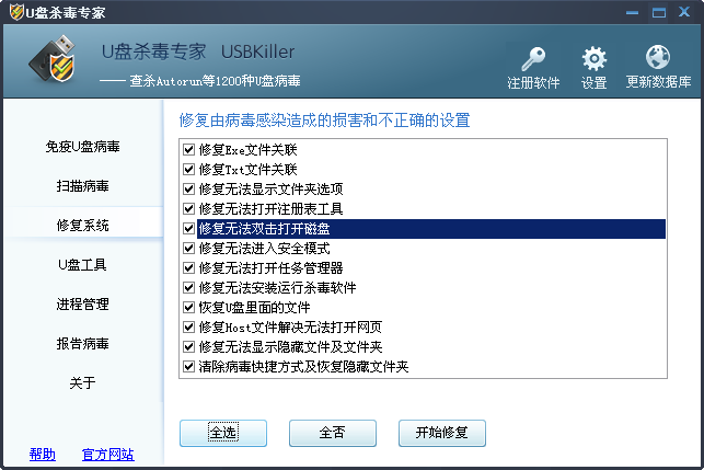 4、利用其“修复工具”,可以修复诸多由于U盘病毒而被破坏的文件或配置。如: