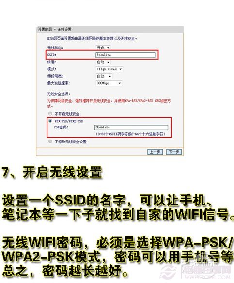 接下来进入无线设置,设置SSID名称,这一项默认为路由器的型号,这只是在搜索的时候显示的设备名称,可以根据你自己的喜好更改,方便搜索使用。其余设置选项可以根据系统默认,无需更改,但是在网络安全设置项必须设置密码,防止被蹭网。设置完成点击下一步。