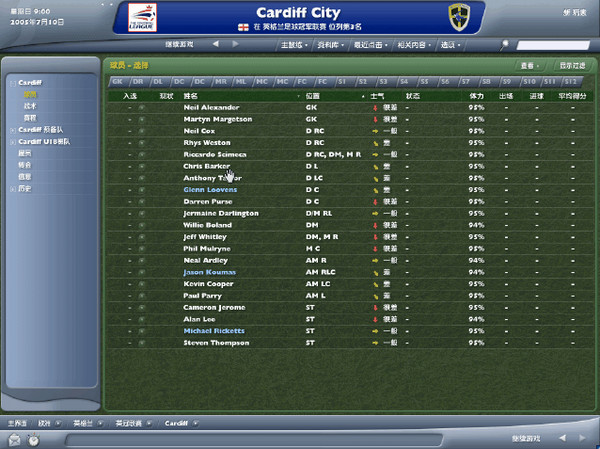首先进入游戏,需要选择教练的最初能力,07是英文版,如果没翻译错我觉得应该有:经济头脑、当世伯乐、教练证书.选择哪一项对游戏应该没有影响,一个赛季结束后根据球队的变化会得到新的能力.然后是选择球队,因为只有英超球队,所以如果想要简单一些就选传统三强里的任意一支吧,07有个特点,只要有优秀前锋就不会缺少进球,曼联有鲁尼,阿森纳有亨利,切尔西有舍瓦和德罗巴,都是可以决定比赛的前锋.选择球队之后是队长选择,系统自动配置了队长的两个人选,从中选择一个就可以了.游戏正式开始,进入赛季前,新主帅上任,然后马上是一系列的新闻,接着球队就会有些问题接踵而至,例如某球员训练不正常之类,那么为了解决好这一系列问题,我们必须要了解好游戏整个操作界面以及各选项的作用,列出如下。