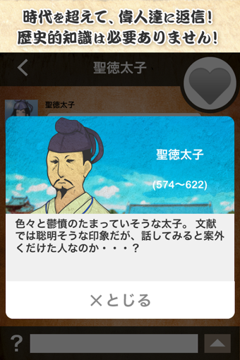 历史上的请回短信汉化版顾名思义,游戏方法就是回短信。幸运如后宫漫男主的你什么都不用做,一开始就能收到许多历史名人的短信——织田信长、圣德太子、宫本武藏,等等等等。这时会出现三种不同的回复,从中选择最恰当的一种就行了——从好到坏分别是粉心、蓝心和骷髅。粉心加最多好感度,骷髅不加。一样米养百样人,不同人有不同性格,只要摸透他们的性格,攻略起来就不是难事(其实还是很难),这证明心如海底针的不止女人。除此之外,等回信也是件难熬的事,因为时间是随机的,有时回你速度快得跟打鸡血一样,有时整天不回,这时你会发现石头门里的闪光指压师是多么可爱的存在。