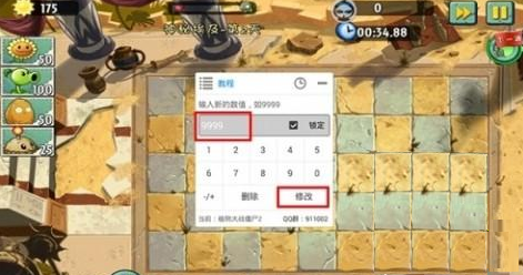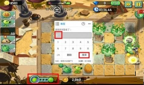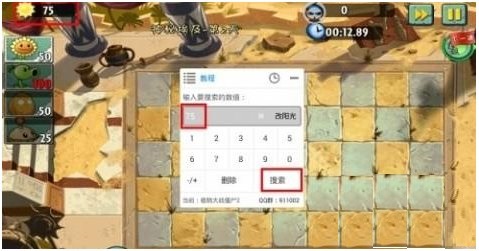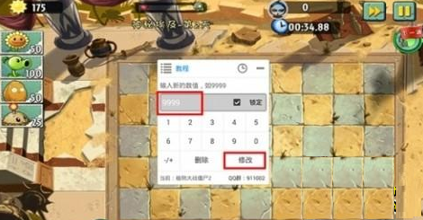 然后大家一定要尽量种更多的植物,防止游戏结束。接着第一次不要搜索0,等到吃到第一个能量豆后,点击葫芦侠的小图标,搜索1,然后返回游戏。注意:不用勾选那个改阳光的选项。