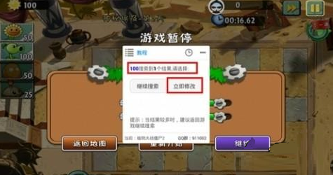点搜索,如果搜索结果较多,就返回游戏,等阳光变化后再搜索。如图中,变化后,搜索的是100,当前找到了一个结果可以修改了,然后点击“立即修改”。