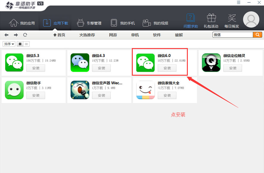 2.打开靠谱助手直接搜微信。然后选一个自已想安装的版本,在此小编选最新版微信6.0,安装过程有点慢,耐心等一会儿即可。微信安装后点启动登录就可以使用微信啦。
