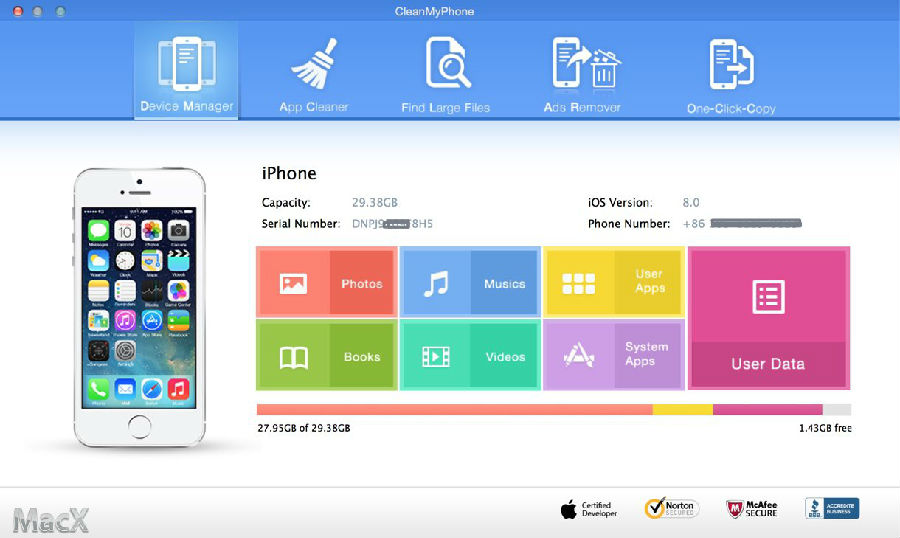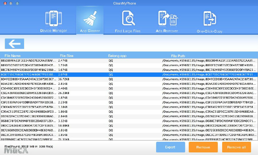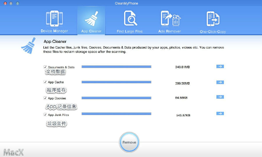 CleanMyPhone的磁盘管理器可以帮助到你的iPhone ,iPad或iPod touch的配置,组织和管理文件和应用程序。你可以找出究竟占用你的磁盘空间并轻松导出,删除不需要的文件,或汇出,并从您的设备卸载不必要的应用程序。 回收存储空间,并保持您的iDevice运行平稳... CleanMyPhone应用程序清洁器可以帮助你去除像文档和数据,应用程序的Cookie各种临时和无用文件获得更多的存储空间,并在iOS设备上应用程序垃圾文件。【使用方法】