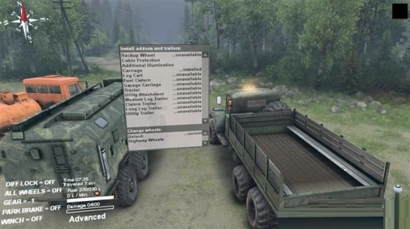 中间这一叠菜单是车辆可以装备的附件或者拖车,比如你要去伐木场,那么运送木材的拖车必须装备上,想运送燃油当然需要油罐了,通过鼠标选择双击即可安装。玩家车辆的轮胎也可以自定义,玩家根据路面来选择吧,摩擦越大的轮胎耗油越多,不需要解释了吧