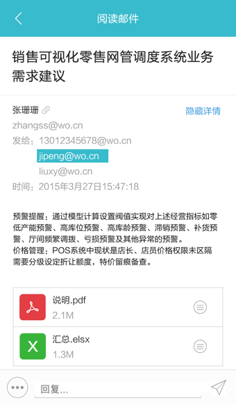 “手机号”就是“邮箱账号”,联通沃邮箱是您实时收发邮件的最佳选择!特有实时推送技术,节省流量,支持通过手机随时随地处理邮件,让您体验更好的移动信息生活。主打