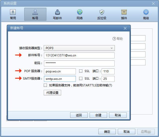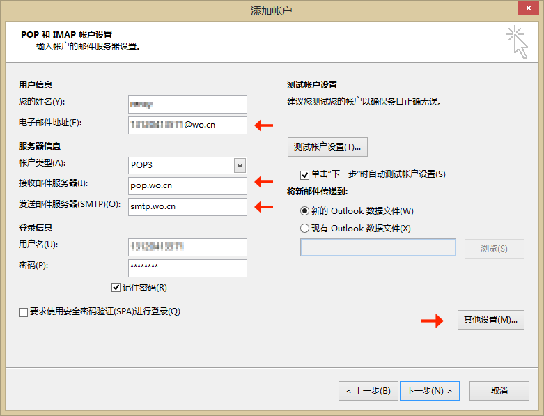 4.配置账户信息、POP服务器地址:pop.wo.cn SMTP服务器地址:smtp.wo.cn