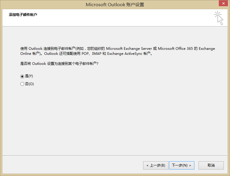 1.新建邮箱,进入向导,添加电子邮件账户,选择是,点击下一步。