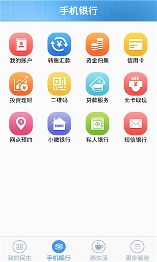手机银行:为您提供小微银行、账户查询、转账汇款、跨行资金归集、投资理财、信用卡、二维码收付、无卡取现、网点预约、回单验证、私人银行、短信银行、贷款服务等丰富的移动金融服务。
