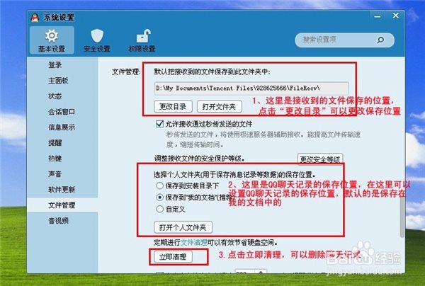 进入“文件管理”的操作界面,之后你就可以看到qq聊天记录存储的具体信息了,在这个页面中,你可以进行更改接收到的文件的存储文件夹、更改qq聊天记录的存储文件夹以及清除qq聊天记录等操作,如下图: