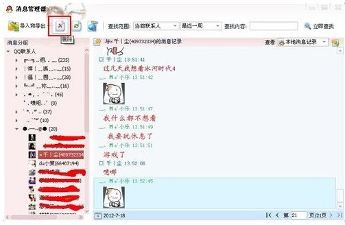 然后会进入到信息管理器页面。这里点击其他的好友也讷讷感看到和其他联系人的对话。然后点击左上角的删除。