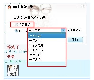 点击删除之后选择要删除聊天记录的时间。可以选择当天的。也可以选择全部删除等。