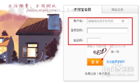 打开支付宝网站,在登录页面输入自己的账户名和密码,填写验证码后点击“登录”按钮登录自己的支付宝账户,如图所示。
