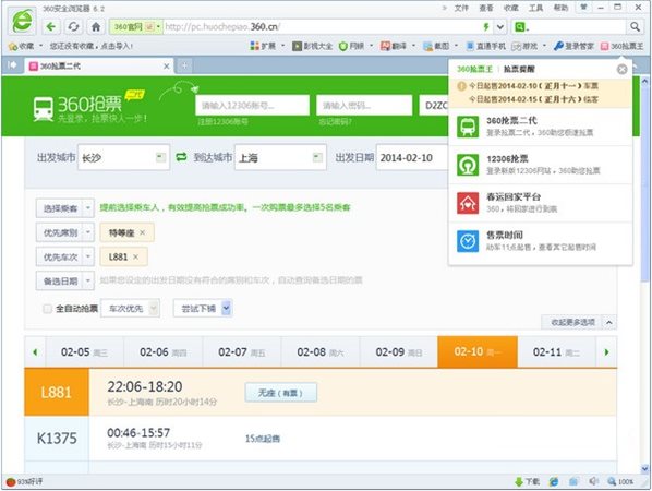 360抢票王二代,手机、电脑随便抢,云端抢票,离线、关机都能抢;安全抢票,自动提醒12306网上订票时间,不错过购票时间;极速抢票,订票无需人工排队,360抢票二代是最快的、最好用的、成功率最高的抢票软件。