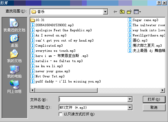 你可以用鼠标点击菜单项的“文件-->打开”选项或者工具栏的打开文件图标来打开你要播放的音乐文件:
