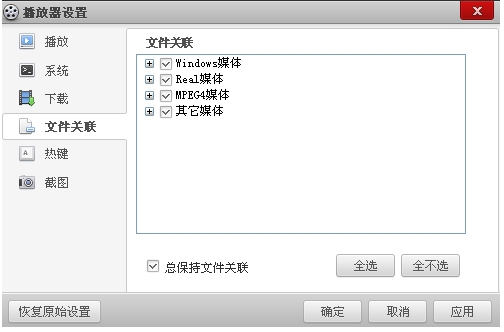 在这里您可以选择您希望关联的文件。默认百度影音将为您关联所有的电影文件,而不关联音乐文件。