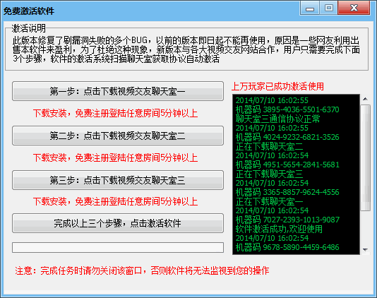 此版本修复了刷漏洞失败的多个BUG,以前的版本即日起不能再使用,原因是一些网友利用出售本软件来盈利,为了杜绝这种现象,新版本与各大视频交友网站合作,用户只需要完成下面3个步骤,软件的激活系统扫描聊天室获取协议自动激活