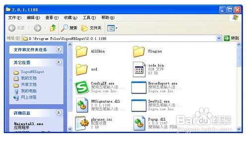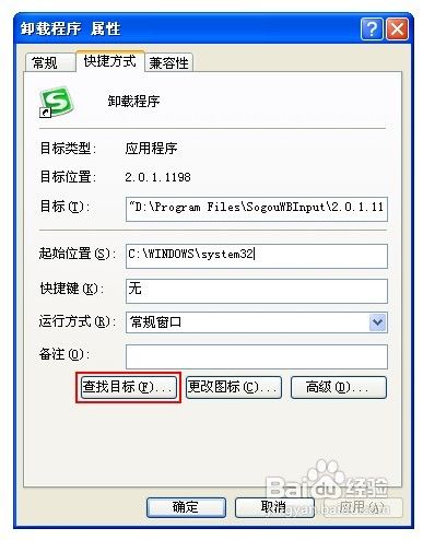 定位到搜狗输入法安装目录中。具体方法:在搜狗输入法卸载程序上右击,选择“属性”,在打开的对话框中点击“查找目标…”即可找到搜狗输入法的安装目录。