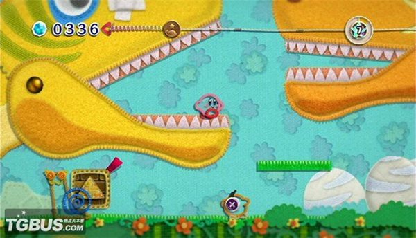 当然,这个全新的世界也带来了新的玩法。卡比的“吞咽”在这里已经不是那么适用了,它有了一根松松的毛线,可以当鞭子一样地用(通过按键,不是体感)。通过这根毛线,卡比可以抓住敌人,或是拆散他们,然后把他们裹成一个毛线团,可以拿来扔着当武器用。毛线还可以当成吊具来用,从一侧荡到另一侧。在某些场合,卡比还可以用毛线拉开一些拉链,打开新的区域或路线。总之这是一根强大的毛线,在Boss战中,甚至还可以抓住Boss的舌头给它以伤害。