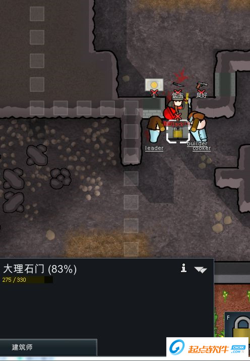解决食宿后,开始布防,前期不建议炮台防守(耗钢耗电),把家围起来,只留一个出口,门用砖石做提高耐久,如下图: