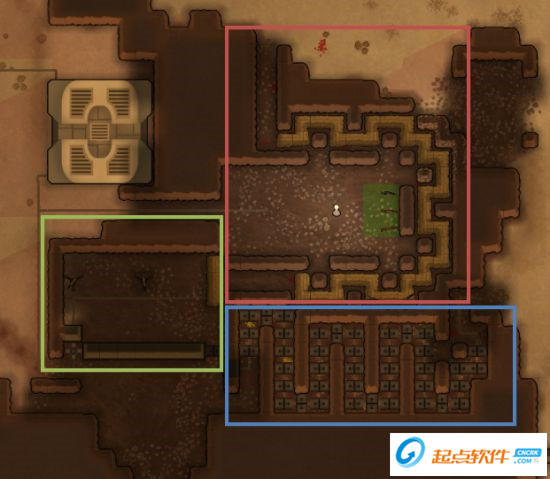 2.绿色区域为炮台室(很重要),一是作为诱饵吸引敌人进入红色区域,二是当动物发疯时射杀动物,因为动物优先攻击小人,如果你在红色区域设伏还是会受伤;