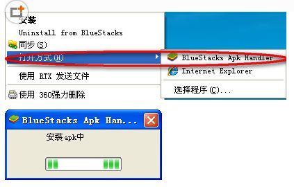 3、如果你看到的不是上面说到的图标样子的话,可以在APK文件上,点击鼠标右键并选择“以BlueStacks Apk 方式打开”,同样也能安装,如下图: