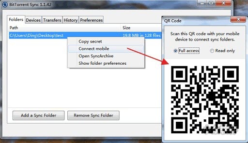 最新版本的 BitTorrent Sync 桌面端已经支持了生成二维码并连接到移动端: