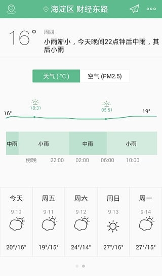 彩云天气可以告诉你未来一小时几点几分会下雨(雪),你可以提前收衣服或者早点回家而不会被雨淋湿。你也可以通过我们的降雨量地图看到整个城市最近的降雨动态,如果广渠门雨太大,我们可以绕着走不是?