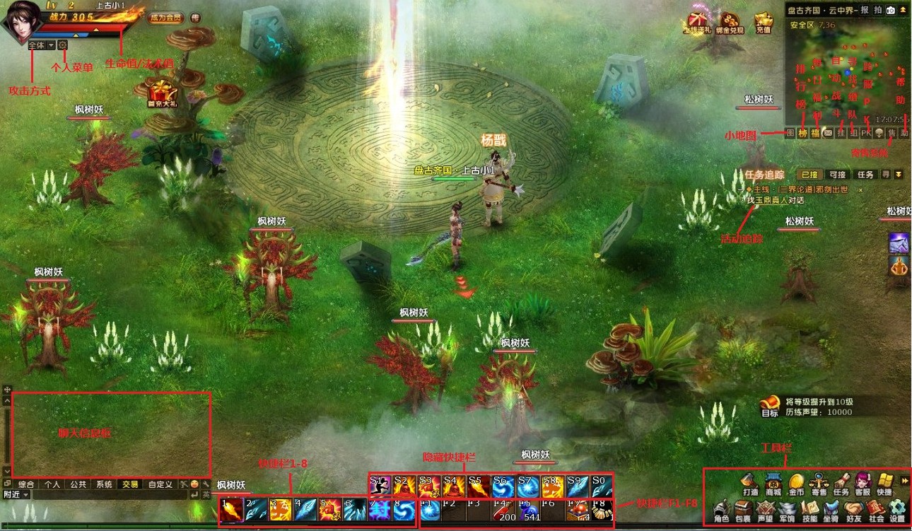进入游戏后,熟悉一下游戏界面,为以后的迅猛发展打下良好的基础,现在让我们根据图片,快速了解一下YY《上古战神》的游戏界面吧。