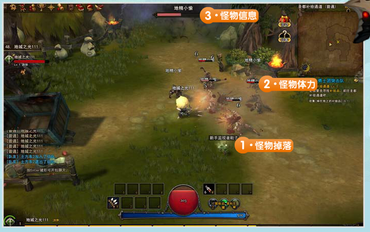 快速的攻击速度与手感是《地城之光》一大特点。落雨般的连打发出轻快的打击 音效,以及敌人的夸张反应,都是良好手感体验的要素。