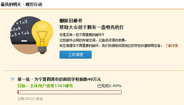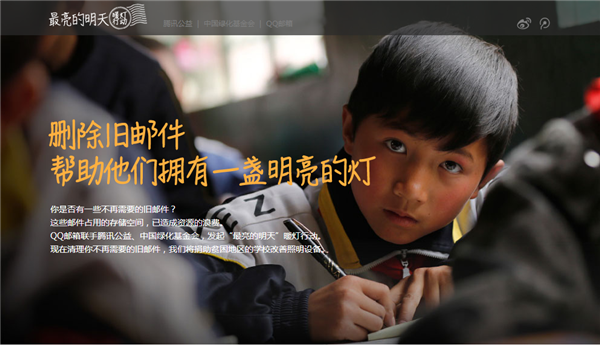 QQ邮箱联手腾讯公益、中国绿化基金会,发起“最亮的明天”暖灯行动,清理你不再需要的旧邮件,我们将捐助贫困地区的学校改善照明设备。现在只要我动动手指删除一定量的旧邮件就能帮助到那些孩子们~ 全体QQ邮箱用户删除到达150T容量的垃圾旧邮件,腾讯就会捐赠40万给那些偏远山区的学校,改善他们的照明条件,减轻国家负担。