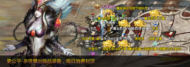 除PK体验之外,《龙界争霸》另一个核心竞争点是绿色公平。研发方用两种方式来抑制超R玩家的出现:第一,商城不售卖任何装备,只卖血药、蓝药、回城卷轴等辅助道具,所有装备都是NPC爆出,装备长期保值;第二,玩家每天和系统的交易金额上有封顶,付费玩家可以花钱得到一些便利,但绝不可能成为超级大R。