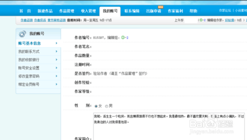 然后点击我的账号,完善作者信息。这时,你只是驻站作者。