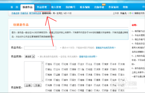 ②、填写作品书名、作品类别、内容简介等相关信息,最后点击创建作品提交;